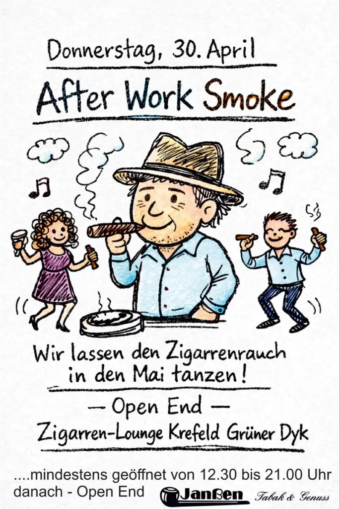 Am Donnerstag, den 30. April, lädt die Zigarren-Lounge am Grünen Dyk in Krefeld zu einem ganz besonderen Event ein: After Work Smoke. Unter dem Motto „Wir lassen den Zigarrenrauch in den Mai tanzen!“ erwartet Besucher ein entspannter Abend voller Genuss, Musik und guter Gesellschaft.