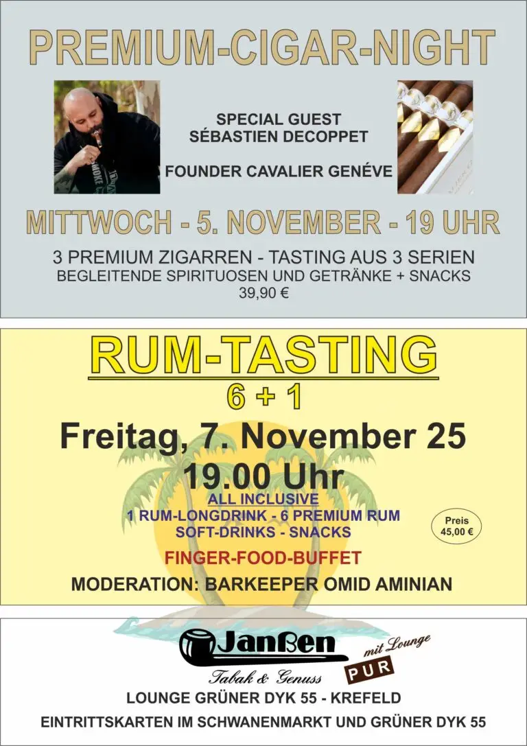 Am Mittwoch, den 5. November um 19 Uhr, lädt Tabak Janßen in der Lounge Grüner Dyk 55 in Krefeld zu einem besonderen Genussabend ein: der Premium Cigar Night – präsentiert in Kooperation mit Kopp Tobaccos und Cavalier Genève.