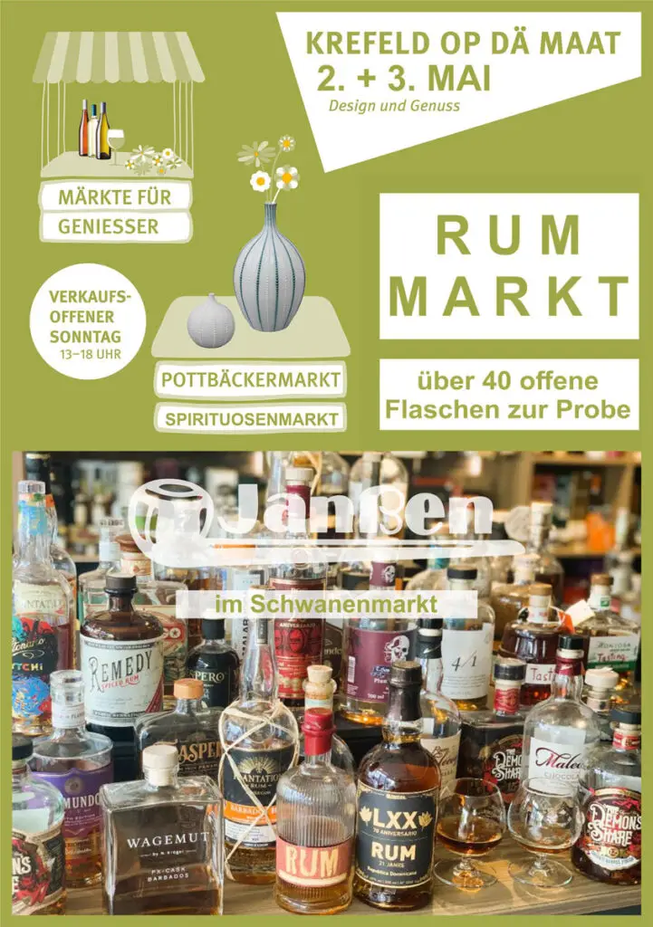 Entdecken Sie den einzigartigen Rum Markt im Schwanenmarkt am 2. und 3. Mai 2026! Unter dem Motto „Krefeld op dä Maat“ erwartet Sie ein genussvolles Wochenende mit über 40 offenen Flaschen erlesener Rumsorten.